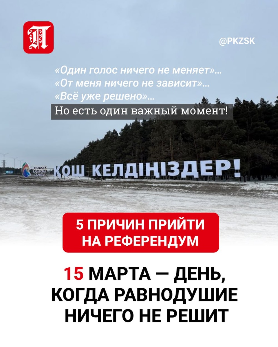 Когда речь заходит о проекте новой Конституции Казахстана и референдуме, можно услышать: «От меня ничего не зависит». «Всё уже решено». «Один голос ничего не меняет». Именно с этого и начинается общественная апатия. Да, у части казахстанцев есть сомнения. Кто-то не верит в реальные перемены. Кто-то считает, что важнее цены и зарплаты. Кто-то устал от политики. Это честные чувства. Их нельзя игнорировать. Но есть один важный момент. Конституция — это не абстрактный юридический текст. Это правила, по которым принимаются законы, распределяются полномочия, работают суды, акиматы, парламент. Это рамка, в которой живёт страна. И 15 марта 2026 года — это не просто дата в календаре. Это возможность зафиксировать свою позицию. Поддержать. Не поддержать. Согласиться. Не согласиться. Не прийти — тоже выбор. Но это выбор в пользу молчания. Когда явка низкая, сигнал слабый. Когда люди приходят — вне зависимости от позиции — общество показывает, что ему не всё равно. Голос «за» или «против» — л