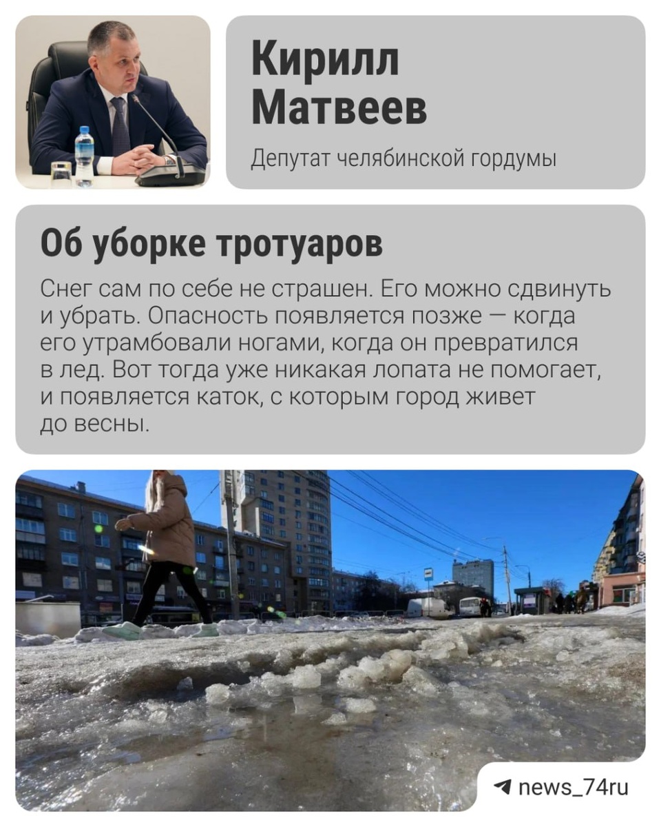 » Депутат раскритиковал уборку тротуаров в Челябинске, он предложил использовать московский опыт Температурные качели из года в год превращают тротуары Челябинска в сплошной каток. Это системная проблема. Депутат гордумы Кирилл Матвеев уверен, что главная причина — в городе до сих пор нет четкой технологии зимней уборки. Он предлагает использовать готовое решение, которое подсмотрел в столице. Далее — от первого лица ⬇️ Часто в пример приводят Москву. Мол, вот там чисто, там умеют. Но если попытаться просто «сделать как в Москве», ничего не выйдет. В Москве зима — это отдельный режим эксплуатации города. Не событие и не аврал, а заранее включенный сценарий, где расписано всё: когда выходят службы, в какой последовательности работают, какие участки в приоритете, сколько времени дается на каждый этап. Технология выстроена так, чтобы этого не допустить. Сначала поверхность обрабатывают — не для того, чтобы «растопить всё вокруг», а чтобы снег не сцепился с покрытием. Затем сразу включа