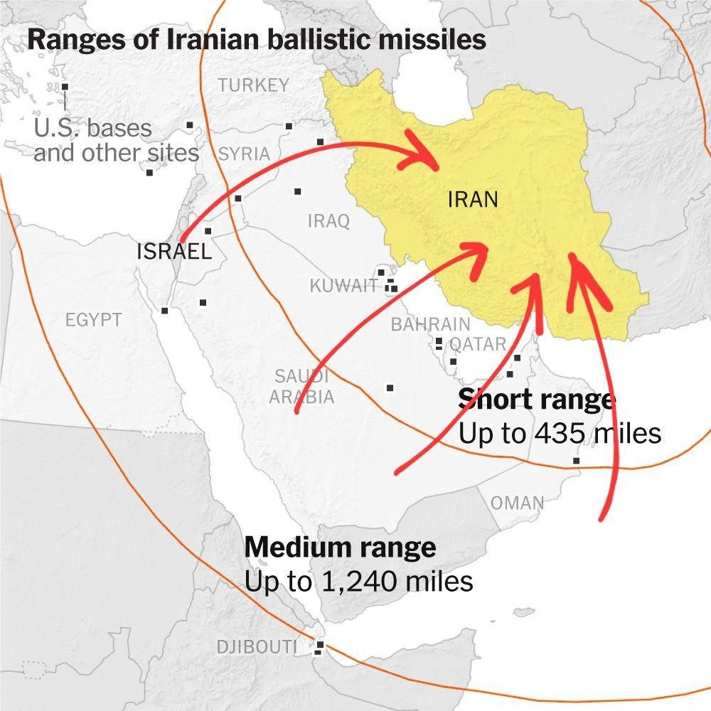 На карте показаны радиусы дальности иранских ракет. Исходя из этого, в зоне досягаемости