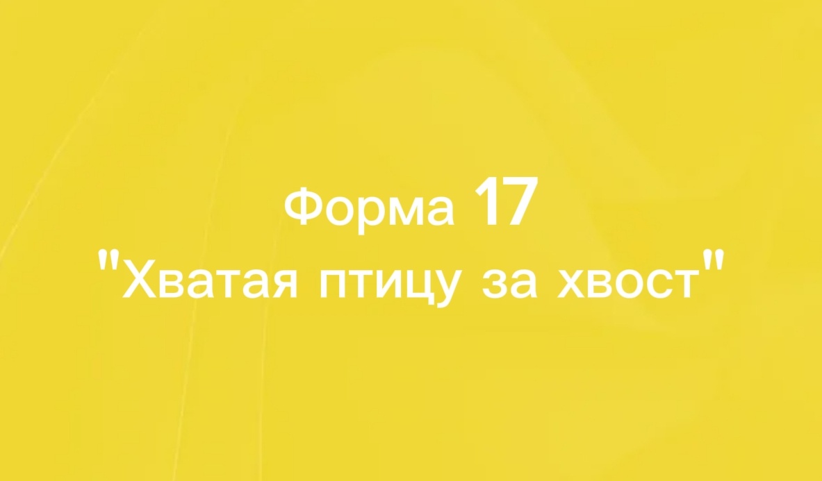 Конечное положение формы 16. Вы удерживаете вес на согнутой правой ноге лицом на юго-восток. Корпус наклонен на юго-восток , составляет с прямой левой ногой одну линию. Ступни параллельны, между линиями ступней расстояние равное длине одной Вашей ступни. Правая ступня плотно удерживает весь вес тела, левая касается пола всей площадью, но веса не несёт, она сохраняет возможность отступления. Левая рука прямая вытянута горизонтально на юго-восток ладонью на юго-восток пальцами вверх, правая рука прямая вертикально вниз перед правым бедром ладонью вниз пальцами на юго-восток. Это Исходное положение формы 17.