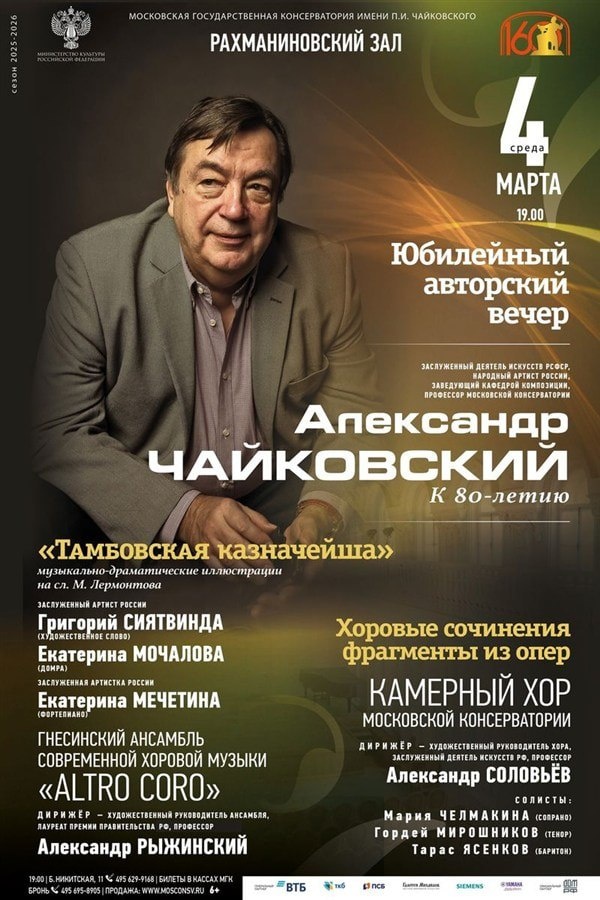 В честь 80-летия заведующего кафедрой композиции МГК, народного артиста России Александра Чайковского выступят лучшие музыкальные силы России. https://www.classicalmusicnews.ru/anons/v-rahmaninovskom-zale-moskovskoj-konservatorii-otmetyat-yubilej-aleksandra-chajkovskogo/?utm_source=cmn_own&utm_medium=telegram 🎼 ClassicalMusicNews.Ru | Telegram | ВК | МАКС