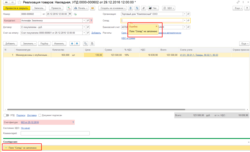 А вот это уже интереснее. Иногда в документе есть поля, которые не отображаются на форме, но они есть в базе. И если они не заполнены — документ не проведётся. Программа при этом может молчать или выдавать что-то непонятное.