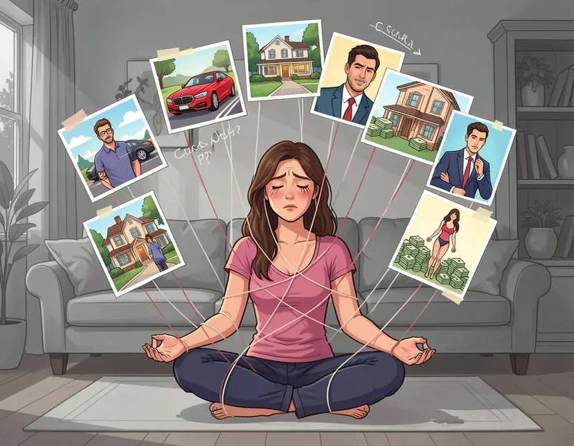 Индустрия женских марафонов желаний поет еще громче: «Если правильно захотеть — к тебе прилетит мужчина с деньгами, квартира в центре и стройная фигура без диет. Всего за 7 дней и 15 000 рублей». Мечтать так, чтобы слюни текли. Клеить карты желаний, писать письма вселенной, синхронизировать чакры с лунным календарем. Если у тебя чего-то нет — значит, ты недостаточно хотела. Или неправильно визуализировала. Или вселенная временно недоступна. — Я уже три года хожу по марафонам желаний, — рассказывает Надя, 34 года. — У меня карта желаний на весь холодильник. Я купила специальную тетрадь «100 дней до мечты». Я встаю в 5 утра, чтобы пописать благодарности вселенной. Я медитирую на деньги. Я аффирмирую любовь. Но мужа нет, денег нет, и я уже ненавижу слово «изобилие». Надя пришла вымотанная не работой, а необходимостью быть счастливой «правильно». Она спала по 4 часа, потому что надо успеть и визуализировать, и поблагодарить, и на вебинар зайти. «Она ничего не делала, только мечтала 15 мин