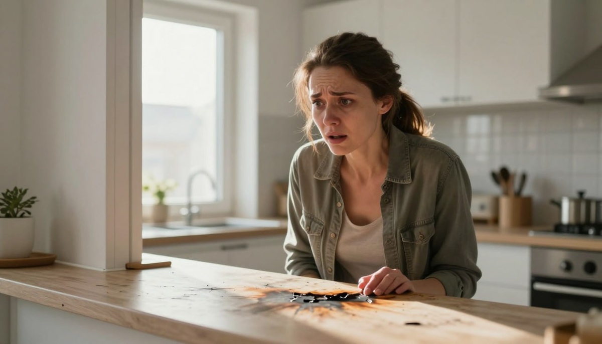 Кухня. Марина остановилась и почувствовала, как подкашиваются ноги. Столешница — с двумя глубокими вмятинами и белёсым пятном, как будто пролили что-то едкое и не вытерли. На острове — кольца от горячих кастрюль, три штуки. Фасад одного шкафчика — с трещиной, ручка болтается.