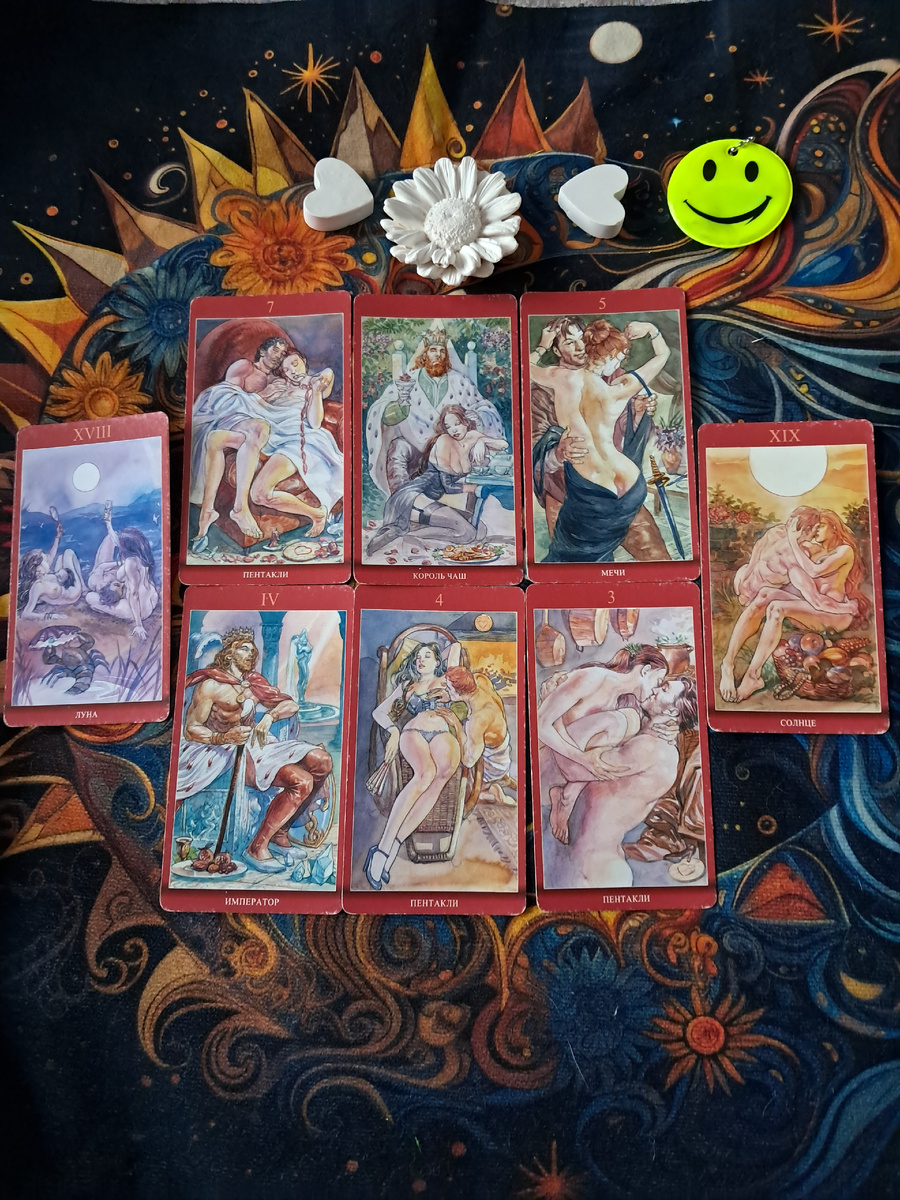 Этот расклад на колоде «Магия и наслаждение» проливает свет на то, что у «него» на уме и как события будут разворачиваться в реальности. Карты выстроились в очень показательную цепочку: от его планов (первые шесть карт) к итоговой реальности (Луна и Солнце). Давайте разберем внимательно.
