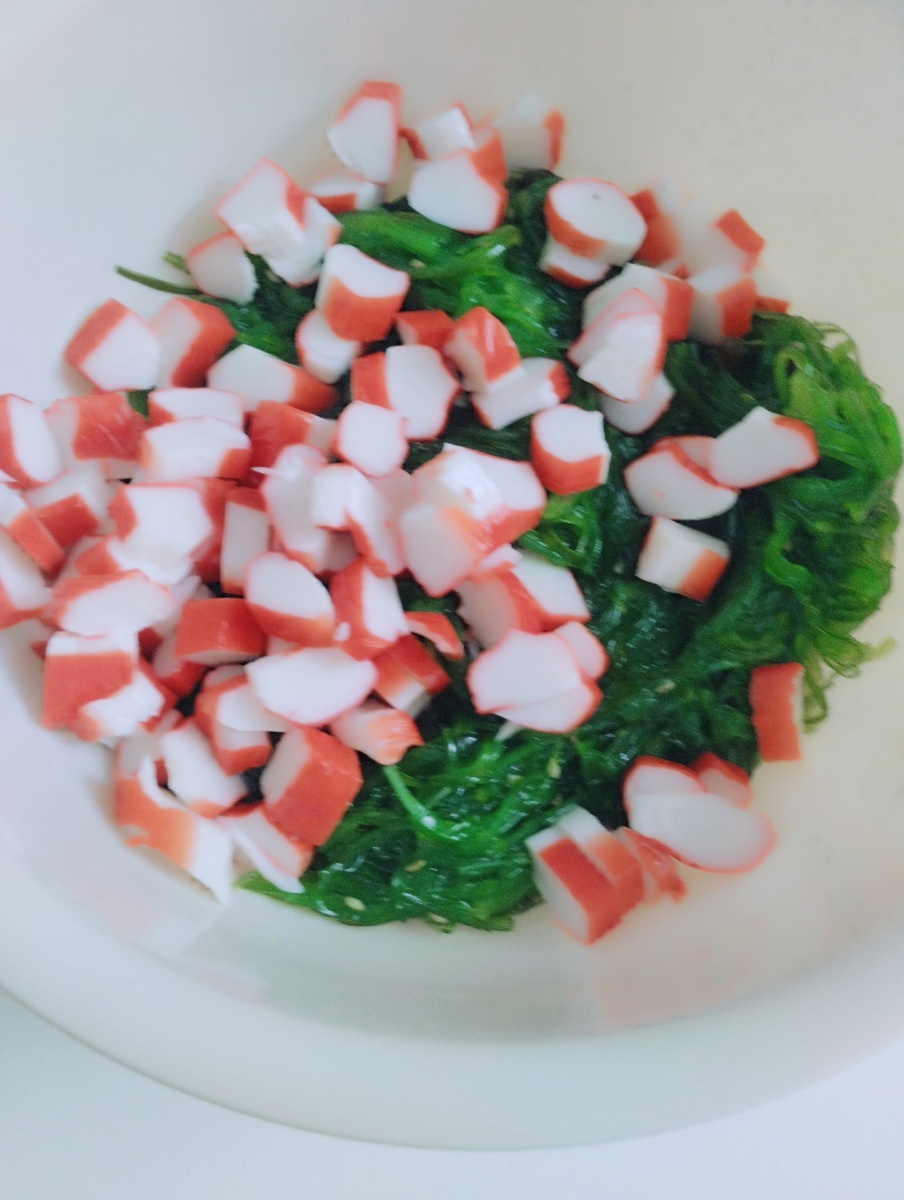 В просторной салатнице соединить чуку вместе с ореховым соусом, нарезанные крабовые палочки и яйца.