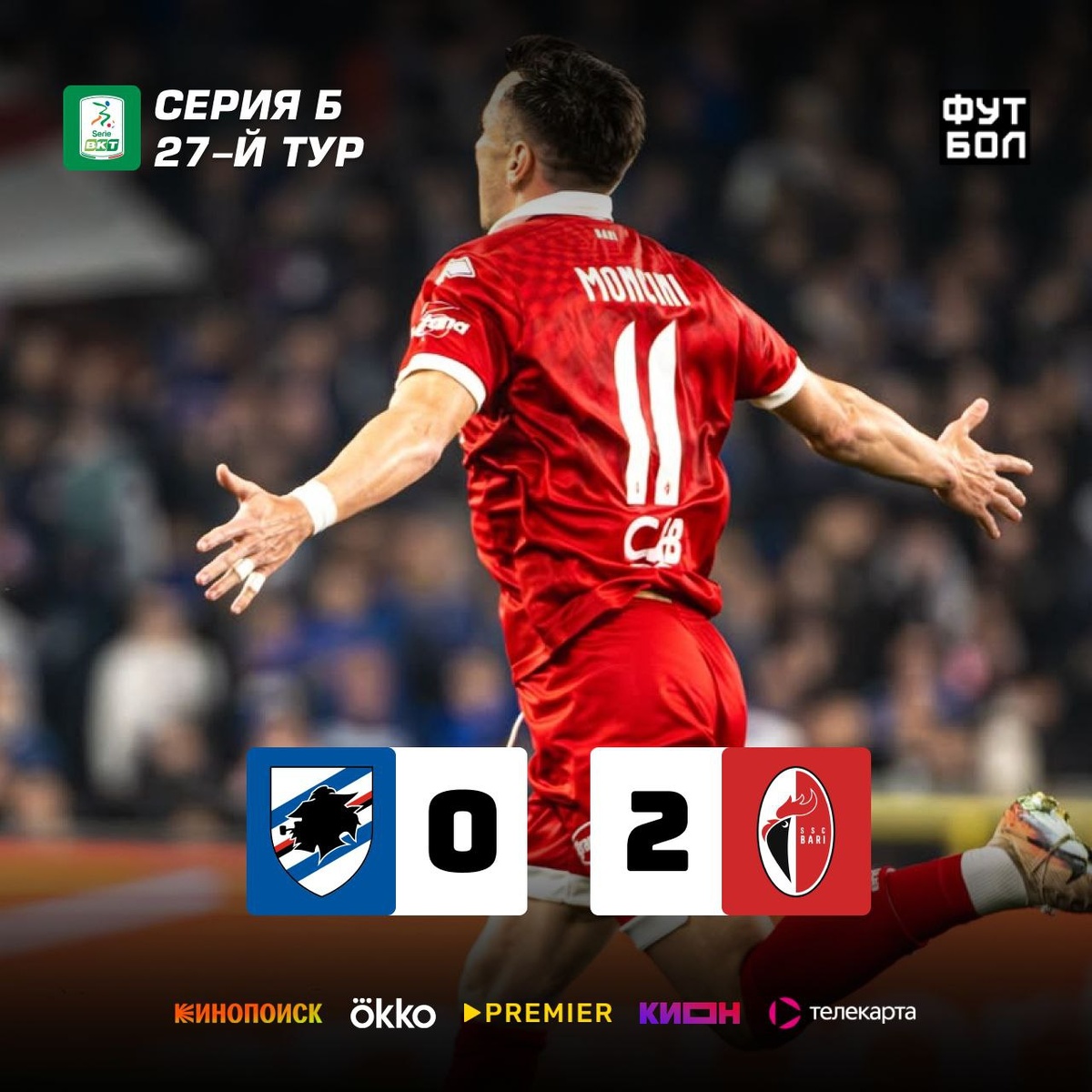 Гости побеждают 2-0. Неожиданная победа команды, которая до этого тура шла предпоследней. Голы забили бывшие игроки итальянской молодежной сборной - Никола Белломо и Габриэле Мончини. Мончини забивал и в первом круге в игре этих команд - тогда они сыграли 1-1. Теперь у него приличные, для игрока команды-аутсайдера, 7 голов в сезоне. А благодаря победе, Бари теперь лишь в одном балле от того, чтобы покинуть зону вылета.
