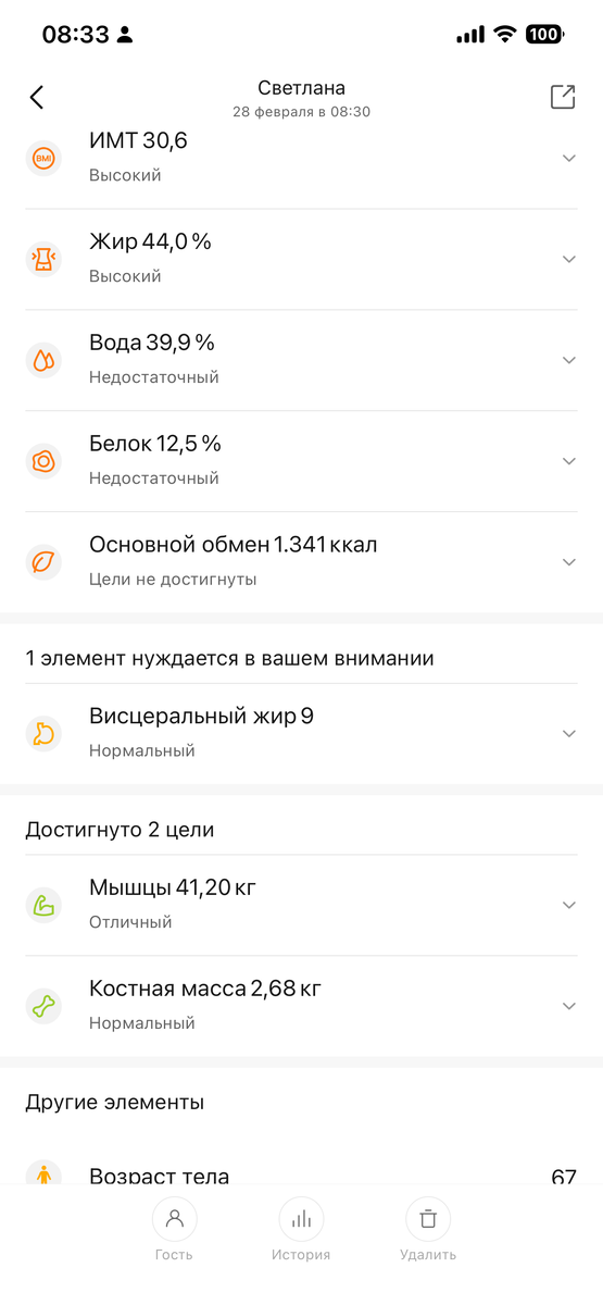 С 10 февраля похудела на 0,5 кг: за счёт жира на 0,1 кг. и за счёт мышц на 0,2 кг.