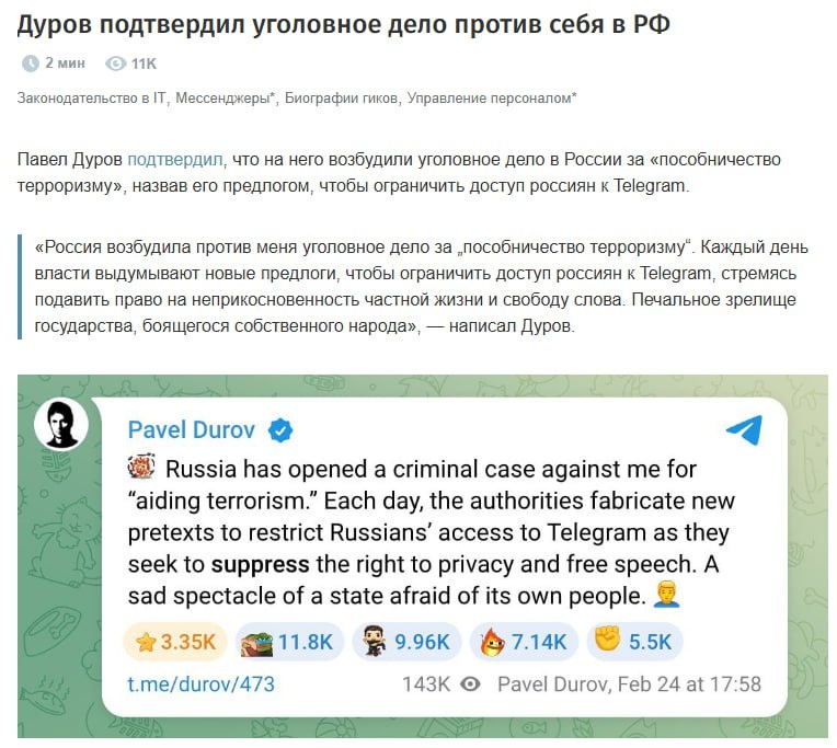 На Павла Дурова завели уголовное дело в России за пособничество терроризму