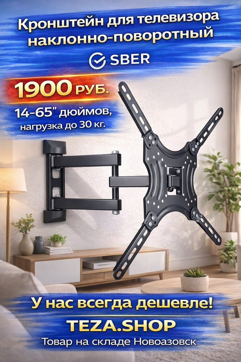 🔥 Спеццена — всего 1900 руб! Надёжное и удобное крепление для комфортного просмотра под любым углом 👌 Характеристики: ✅ Наклонно-поворотный механизм ✅ Подходит для телевизоров с диагональю 14"–65" ✅ Стандарт крепления VESA до 400×400 ✅ Максимальная нагрузка — до 30 кг 📢 У нас всегда дешевле! 🗺 TEZA.SHOP 🛒 В наличии на складе (Новоазовск) 📞 +7 (949) 301-08-41