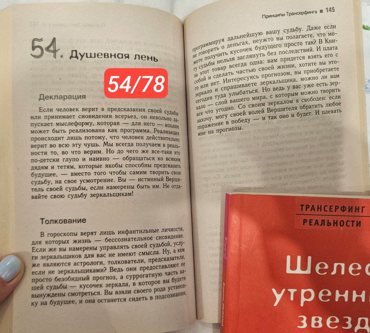 54/78 Практикум управления реальностью - Трансерфинг Душевная лень "Мы всегда получаем в реальности то, во что верим. Но до чего же все-таки это по-детски глупо и наивно - обращаться ко всяким дядям и тетям, которые якобы способны предсказать будущее, - вместо того, чтобы самим творить свою судьбу на свое усмотрение." "Они предоставляют не просто безобидный прогноз, а суррогатную часть вашей судьбы - кусочек зеркала, в которое вы будете вынуждены смотреться. Вы взяли своего рода установку на будущее, и она останется сидеть в подсознании, программируя дальнейшую вашу судьбу. В книгу судьбы нельзя заглянуть без последствий. И плата за этот товар всегда одна: вам придется взять его с собой и сделать частью своей жизни, хотите вы этого или нет. Интересуясь прогнозом, вы приобретаете зеркало, и спрашиваете зеркальщика, можно ли вам сегодня туда улыбаться. Но ведь у вас уже есть зеркало - слой вашего мира, с которым можно творить все, что угодно. Со своим зеркалом я свободен: если захочу