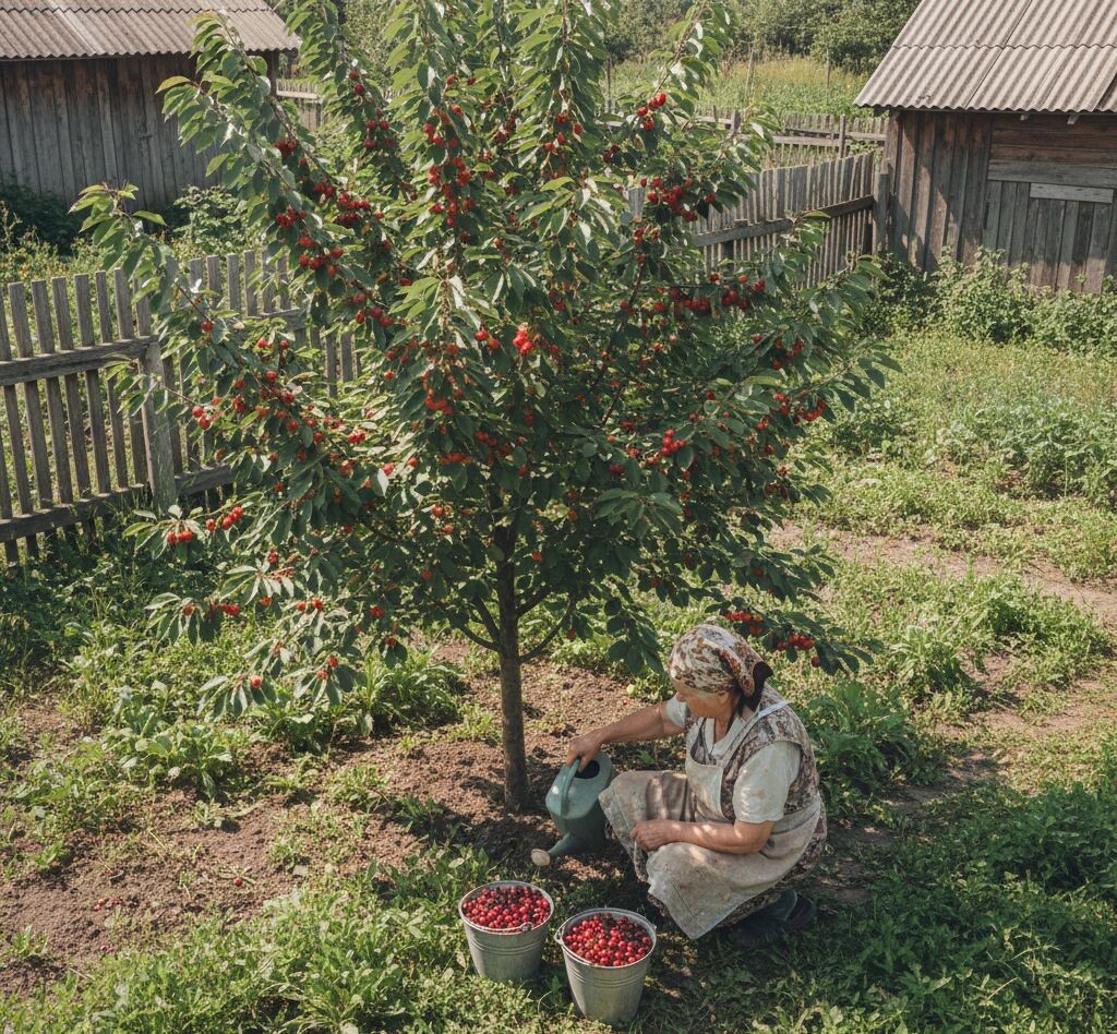 · Июль (после сбора урожая): Как только последнюю ягодку собрали, не думайте, что работа закончена. Сейчас вишня закладывает почки на следующий год! Я даю ей калийно-фосфорную подкормку. Беру монофосфат калия (столовую ложку на ведро воды) и поливаю под корень. Это помогает деревцу восстановиться после плодоношения.