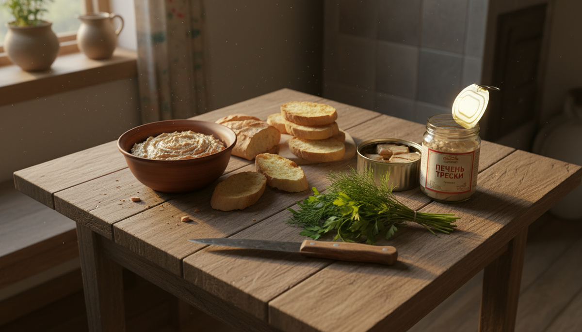 - Печень трески — 200 г (даёт кремовость и «богатый» вкус).
