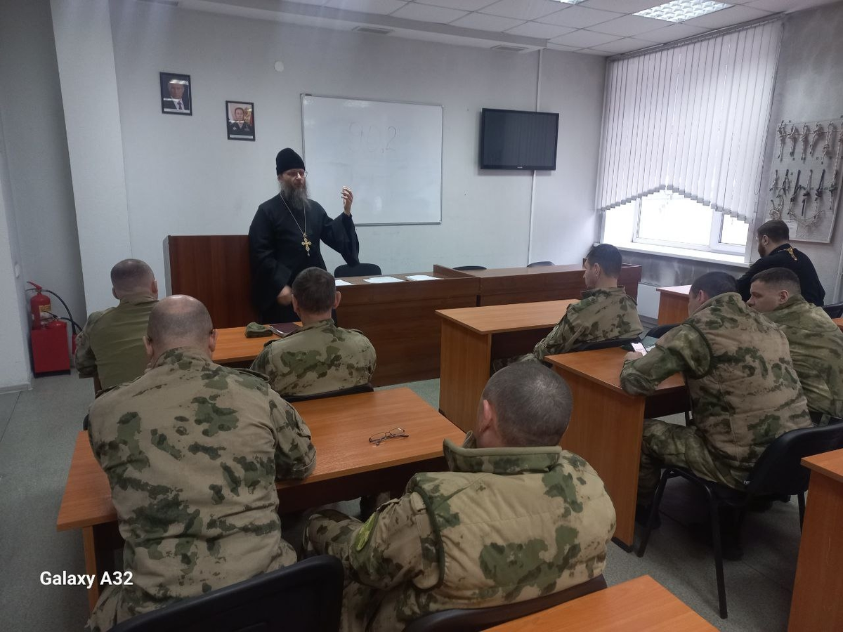 18 февраля 2026 года в ОМОН «Рубеж» Росгвардии г. Новокузнецка прошла беседа личного состава со священнослужителями. Учреждение посетили руководитель отдела по взаимодействию с Вооружёнными силами, правоохранительными органами и казачеством Новокузнецкой епархии иерей Тимофей Гайибов и настоятель храма свт. Николая Чудотворца протоиерей Алексей Кузнецов. Священнослужители побеседовали с сотрудниками о христианской нравственности и о празднике Сретения Господня. Данная встреча стала частью работы Отдела по взаимодействию с Вооружёнными силами, правоохранительными органами и казачеством Новокузнецкой епархии Кузбасской митрополии.