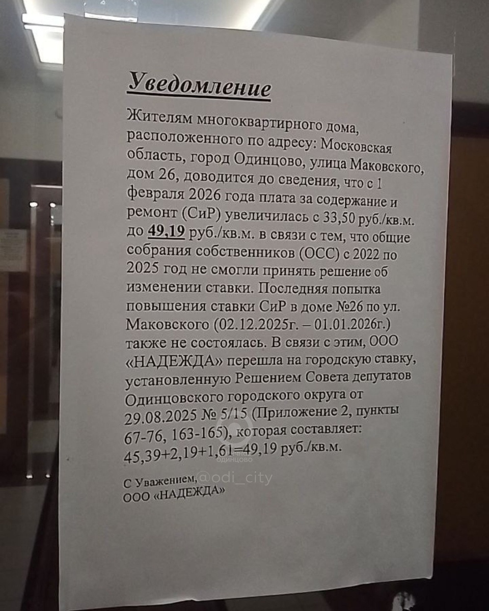 Управляющие компании ссылаются на Решение Совета депутатов Одинцовского округа от 29.08.2025 № 5/15. Жильцы дома № 26 по улице Маковского, например, получили увеличение с 33,50 до 49,19 рубля, с чем многие не согласны. «В доме по адресу: улица Маковского, 26, УК "Надежда" просто захотела и повысила тариф беспочвенно, поставила тариф в размере 49,19, ссылаясь на то, что жители не проголосовали на её ОСС, где она предлагала повышение, и поэтому может взять муниципальный тариф. Опять же, сама решила, игнорируя то, что у жителей есть действующее решение ОСС от 2021 года, где тариф выбран», – рассказала одна из жительниц дома. Источник: Открыть
