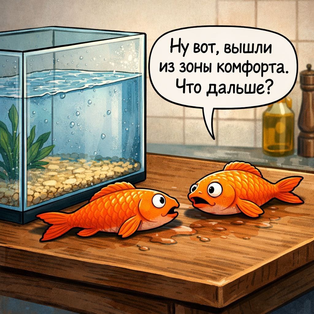 У меня есть любимая картинка. Пустой аквариум. На столе – две рыбки. Плашмя. И одна другой говорит: «Ну вот, мы вышли из зоны комфорта. Что дальше?» Я каждый раз думаю: а дальше – эволюция закончилась. Мы так любим эту мантру – «выйди из зоны комфорта». Как будто зона комфорта – это болото, а не среда, где ты вообще-то дышишь. Да, развитие начинается там, где мы пробуем новое. Меняем сценарии. Делаем по-другому. Отказываемся от привычного. Но есть нюанс. Выйти из зоны комфорта – не равно выпрыгнуть из аквариума на кухонный стол. За пределами привычного действительно может быть океан. А может быть линолеум. И вот тут два скучных, но жизненно важных правила. Первое. Вы должны понимать, *зачем* вы прыгаете. Не потому что «так надо». Не потому что «все развиваются». А потому что есть конкретная цель, ради которой вы готовы временно потерять устойчивость. Иначе вы просто рыба с амбициями. Второе. У вас должен быть ресурс. Потому что «новая жизнь» – это не фотосессия на рассвете.