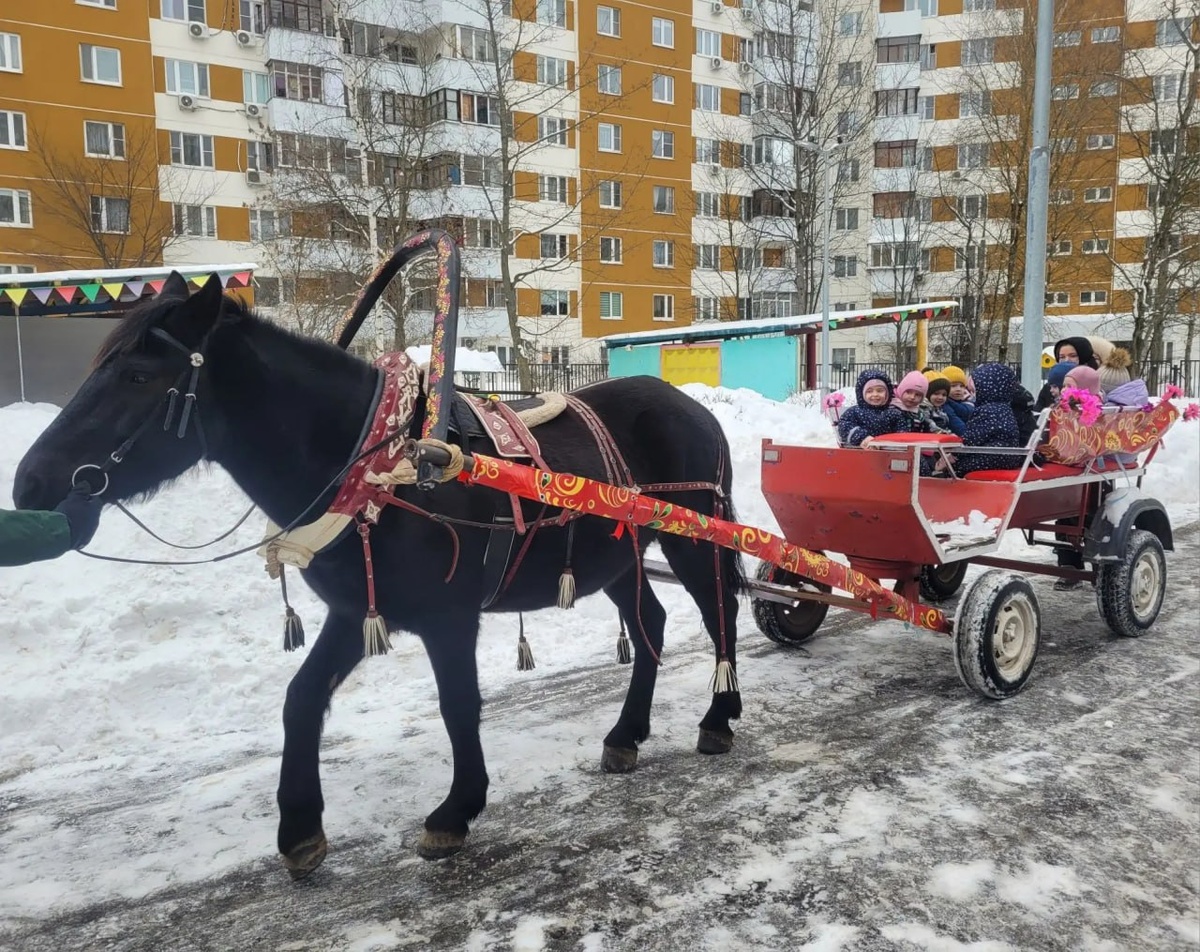 В дошкольные отделения «Митюша», «Созвездие» и «Родничок» к ребятам прискакали лошадки. В сопровождении взрослых дети с радостью рассаживались по скамеечкам в телеге и с искренним восторгом катались по территории детского сада. Кратковременное общение с лошадьми вызывает у детей множество положительных эмоций, поднимает настроение. Дети всегда ждут таких сюрпризных моментов и с удовольствием катаются. Катание на лошадях – это чудесное развлечение, которое успокаивает нервную систему ребятишек и нормализует их эмоциональный фон. Ребятам была предоставлена уникальная возможность пообщаться с этими прекрасными животными. Заботливые владельцы привели к нам лошадок по кличке Венера и Матильда. Дети с нетерпением ждали этого дня. Педагогам удалось создать особое настроение: дети и воспитатели были в нарядных платках, с баранками, угощением для лошадки. Легкий морозец с незначительным ветерком, добавляли катанию дополнительную изюминку, порцию хорошего настроения, задора и веселья. Было радо