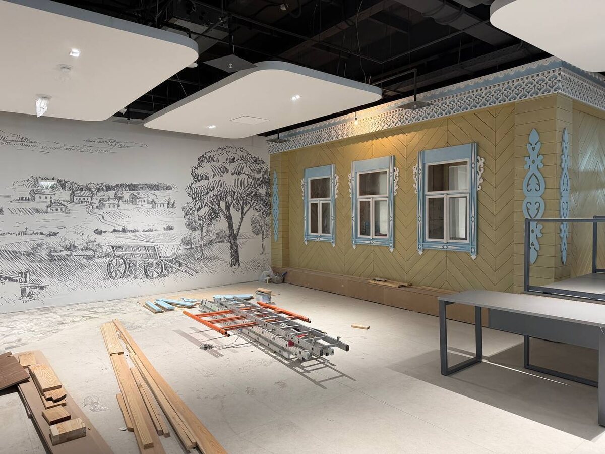 Сейчас в центре ведутся работы по отделке помещений, завозится мебель и оборудование. На фото виден внутренний интерьер, стилизованный под русский дом с деревянной отделкой. На стенах закреплены панели с яркими цветовыми растительными орнаментами. Также видно подвесные светильники, стилизованные под огромные чашки с блюдцами. ⭐️ Татарстан News 📲 Татарстан News в MAX
