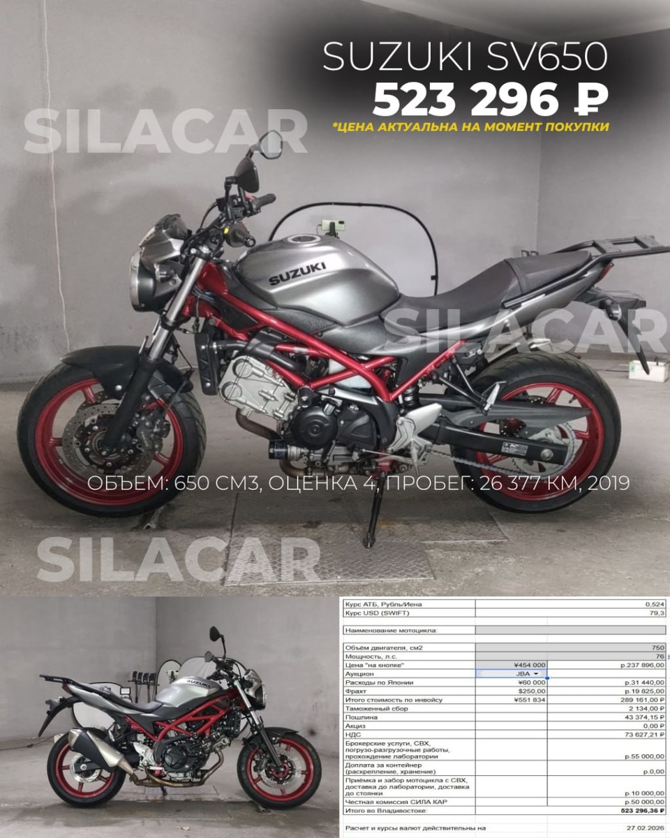 ️⃣ Все цены РЕАЛЬНЫЕ и указаны во Владивостоке, с учетом всех таможенных пошлин и утилизационного сбора на физ-лицо и нашей комиссией: 🥱SUZUKI SV650 📍Год: 2019 📍Объем: 650 см3 📍Оценка 4 📍Пробег: 26 377 км 📍Под ключ: 523.296₽ 🤡YAMAHA MT-07 📍Год: 2014 📍Объем: 700 см3 📍Оценка 4 📍Пробег: 26 036 км 📍Под ключ: 593.872₽ 😲HONDA NC750X DCT 📍Год: 2024 📍Объем: 750 см3 📍Оценка 4 📍Пробег: 3 300 км 📍Под ключ: 876.362₽ 📍Для консультации и брони мотоцикла пишите менеджеру Дмитрию 📞 +7(908)979-36-94 🔵 @SilaCar_DmGor 👉Для ПОКУПКИ МОТО жмите сюда💪 💻Самостоятельный расчет на нашем сайте: silacar.ru ❗️А для тех, кого интересует автомобиль : 88007002375 Мы в MAX 📱 ДОРОГО НАСЧИТАЛИ? Напиши нам📍БЕСПЛАТНО ПРОВЕРИМ РАСЧЕТ КОНКУРЕНТОВ НА СКРЫТУЮ КОМИССИЮ 👆🏼❗️ СИЛА КАР – СИЛА В ПРАВДЕ💪