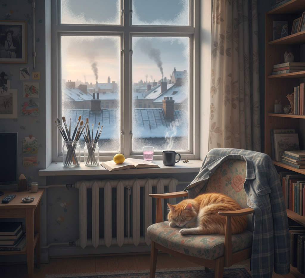 На подоконнике – банка с кистями и стакан с розоватым облаком от вчерашней акварели. На столе – альбом, раскрытый на недорисованном натюрморте с лимоном. Кот Рыжик – взяла из приюта три месяца назад, спит на моей куртке.