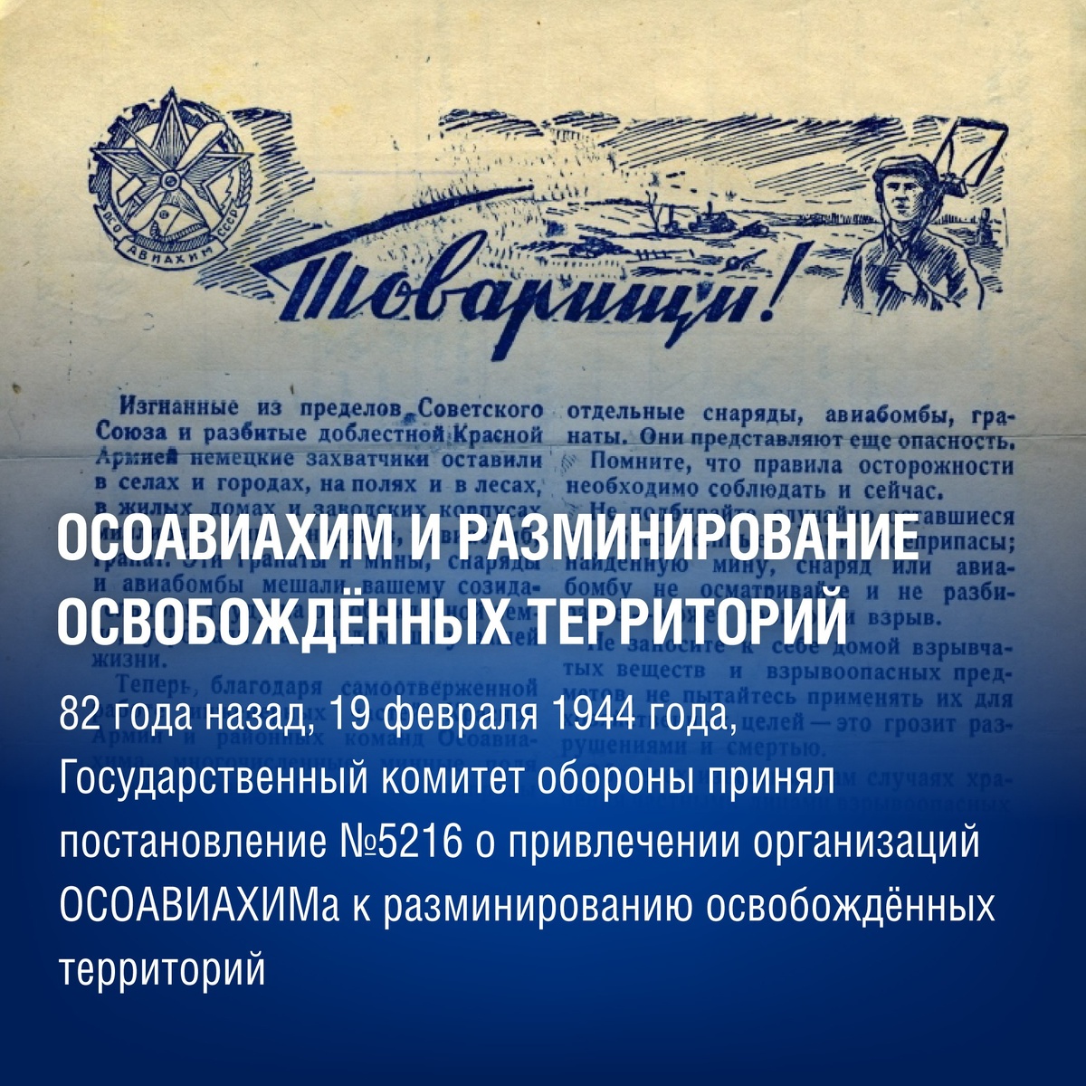 19 февраля 1944 года Государственный комитет обороны принял постановление № 5216 о привлечении организаций ОСОАВИАХИМа к разминированию освобождённых территорий. После освобождения городов и сёл миллионы мин и неразорвавшихся боеприпасов продолжали представлять смертельную опасность для мирных жителей. Армейские сапёры были задействованы на фронте, продвигавшемся на Запад. Разминирование в тылу стало задачей добровольцев ОСОАВИАХИМа. ▶️В карточках — факты и масштаб этой операции, позволившей вернуть к мирной жизни огромные территории страны и создать условия для восстановления освобождённых регионов. #ДОСААФ #ДОСААФРоссии #ИсторияДОСААФ #ОСОАВИАХИМ