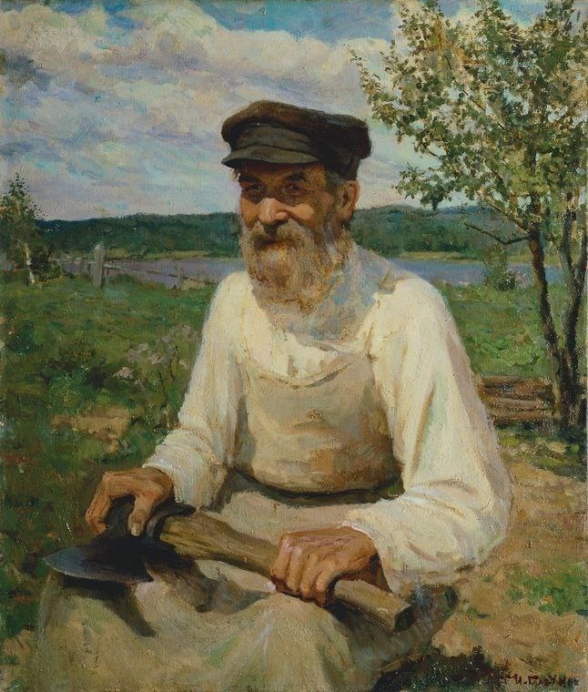 Это «Старик с топором» Ильи Глазунова. 1949 год. Художнику всего 19 лет. Война только-только отгремела, у него самого почти вся семья погибла в блокаду. И вот он едет в деревню, встречает простого мужика - деда Матюшку - и просит разрешения его написать.