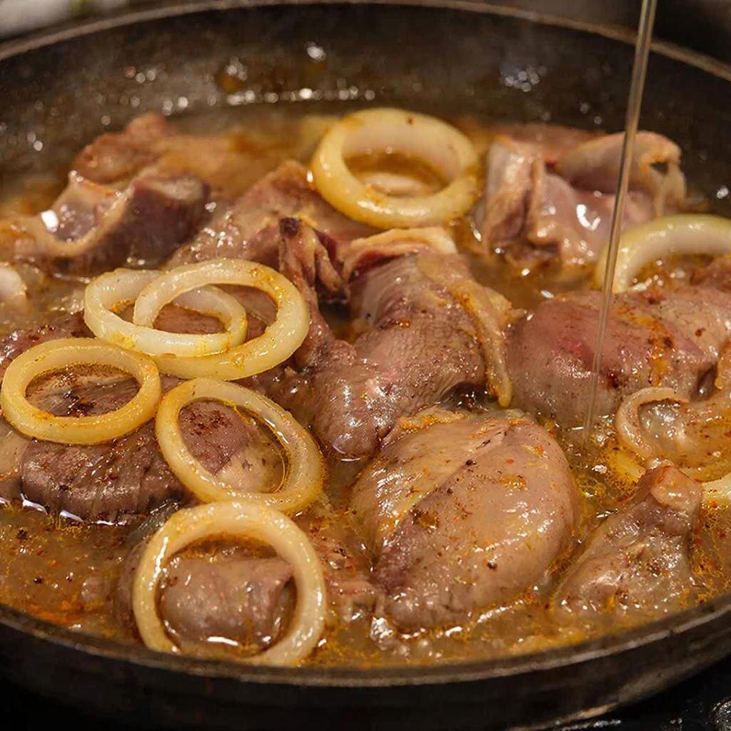 Влейте в сковороду немного бульона (около 100-150 мл). Бульон должен лишь слегка покрывать дно, не полностью погружая субпродукты.