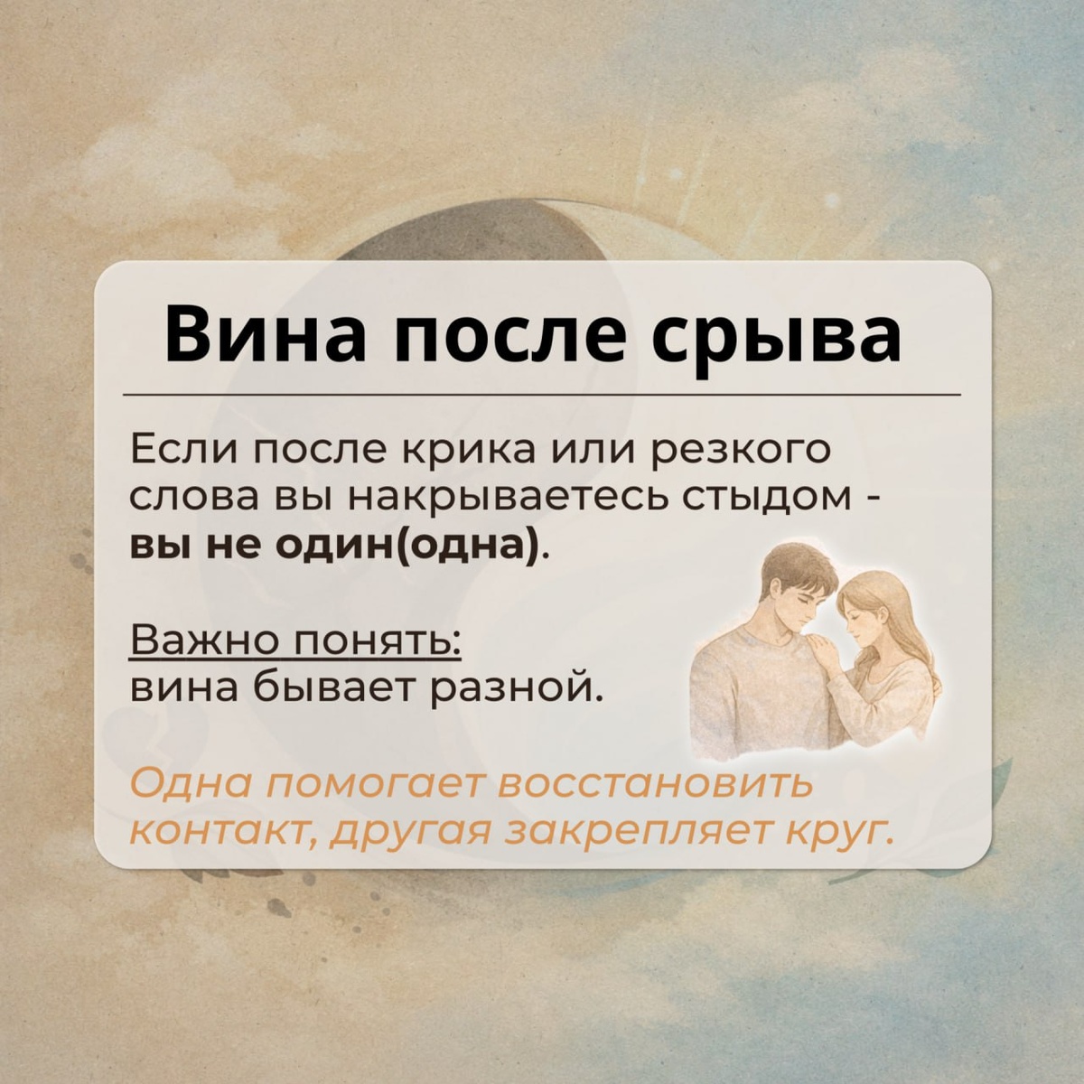? Друзья, вина после срыва может либо помогать, либо разрушать. Если она превращается в самокритику, ресурс падает еще сильнее - и круг повторяется. 📄 Мы собрали карточки, которые помогают отличить токсичную вину от ответственности и восстановить контакт с ребенком без самоуничтожения. Напишите в комментариях: как вы восстанавливаетесь после срыва?
