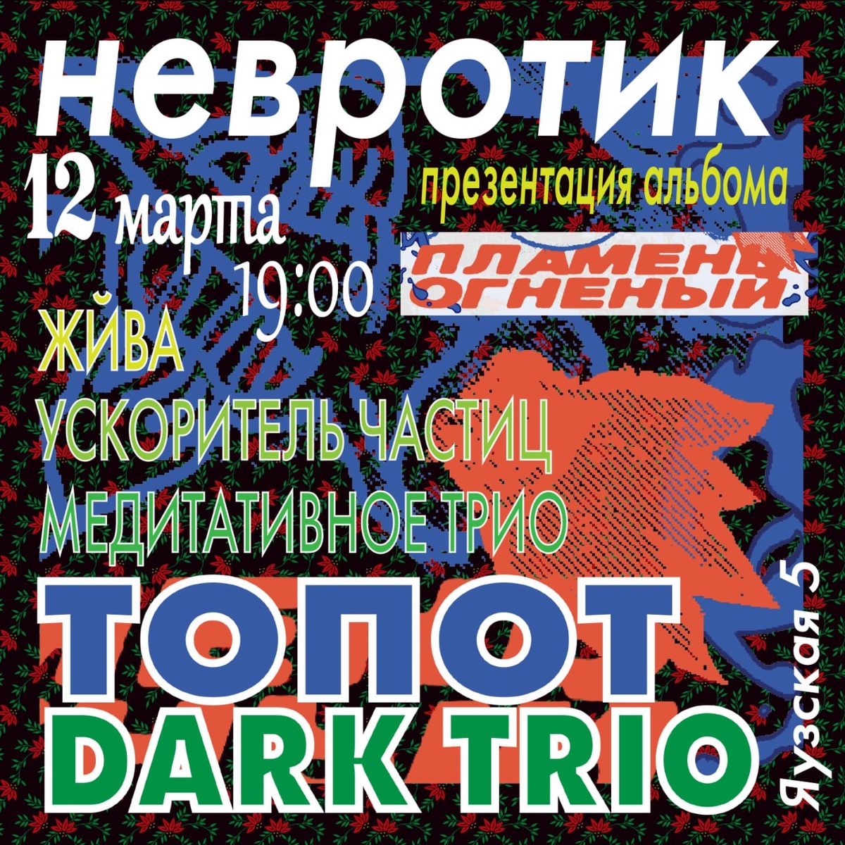 #avantgarde #emo #indie #jazz #metal #postpunk #psychedelic #rock #shoegaze ► «Пламень огненный» ТОПОТ dark trio ~релиз-пати~ ● TG ● VK Нам очень не хватало этой музыки. И каким то мистическим образом мы сложили свои песни. Приходите и разделите с нами Пламень. Участники: ► ТОПОТ dark trio ● TG ● VK ► ЖЙВА ● TG ► Ускоритель частиц ● TG ► Медитативное трио (С. Храмцевич, С. Бурлаков, И. Кручинин) Билеты от 1000₽