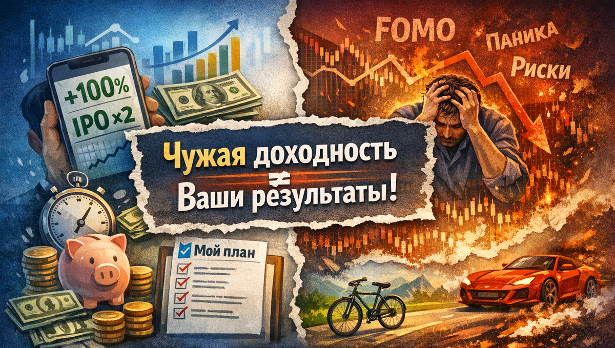 Фондовый рынок - это не соревнование "кто больше заработал за месяц". Но стоит открыть соцсети или инвестиционные каналы, как начинается парад доходностей: +30% за квартал, +120% за год, "зашёл в IPO - удвоился". И в этот момент у многих инвесторов включается простая эмоция - FOMO (fear of missing out), страх упустить возможность. Разберёмся, почему ориентация на чужую доходность - одна из самых опасных ловушек для инвестора. Доходность - это всегда производная от: Один инвестор мог купить акции на панике в 2022 году, другой - на хаях 2021. Один держит 80% в акциях, другой - 50% в облигациях. Формально они инвестируют "в рынок", но по факту - это две разные истории. Когда вы видите "+40% за год", вы не видите: Сравнивать свою консервативную стратегию с агрессивной - всё равно что сравнивать велосипед и спорткар по скорости. Они решают разные задачи. FOMO - это эмоциональный триггер, который заставляет: Парадокс в том, что доходность, которую вы видите - это прошлое. Решение, которое вы