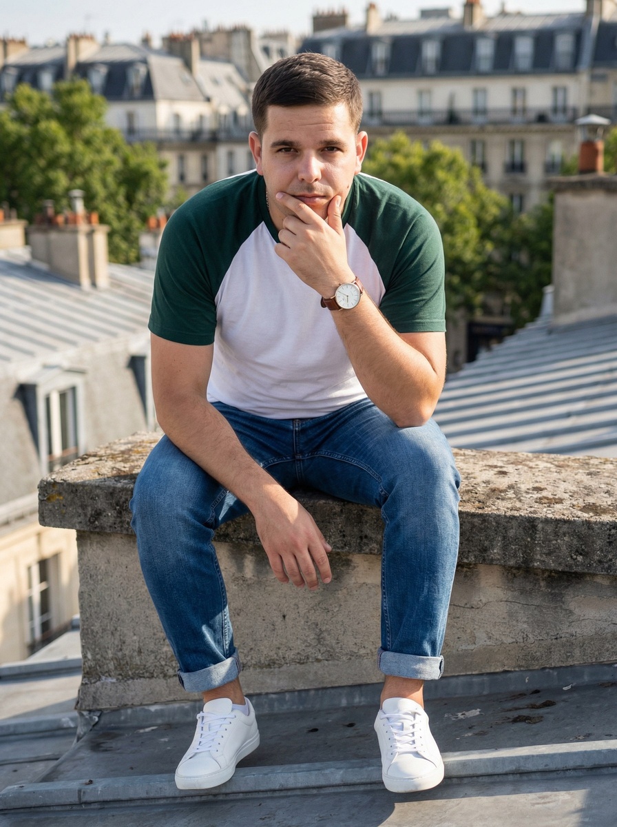 🤖Генерировать можно здесь: 👉БОТ ДЛЯ ГЕНЕРАЦИИ Режим Nano Banana Pro 4К ИНСТРУКЦИЯ Портрет молодого мужчины с загруженного фото, сидящего на балконе или крыше в городской среде, стиль уличной моды (streetwear). Внешность: Черты лица, форма глаз, цвет волос и общий облик молодого мужчины строго перенесены с загруженного референсного фото - точное сходство обязательно. У него выразительные глаза, немного задумчивый взгляд, направленный прямо в камеру. Кожа естественная. Эмоции: Спокойный, расслабленный, слегка задумчивый. Рука приподнята к лицу — пальцы касаются подбородка или губ, создавая ощущение размышления или непринужденности. Стиль одежды: Белая футболка реглан с темно-зелеными рукавами и воротником. Синие джинсы с отворотами, белые кроссовки (стиль “clean sneakers”). На левом запястье — классические часы с белым циферблатом и кожаным ремешком. Фон: Размытый городской пейзаж — вид на крыши зданий, возможно, европейский город (например, Париж), с мягкими архитектурными формами