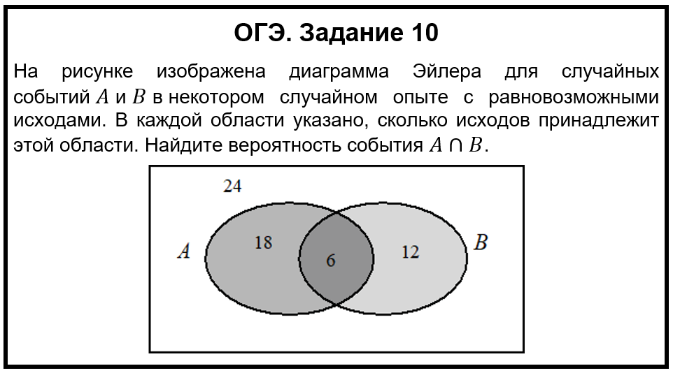 Вы когда-нибудь путались в кругах Эйлера? Эта задача из нового банка ФИПИ как раз про них. Спойлер: если понять диаграмму, вероятность находится в одно действие. Но именно здесь многие теряют баллы. Давайте разберёмся раз и навсегда! 👇 На рисунке изображена диаграмма Эйлера для случайных событий A и B в некотором случайном опыте с равновозможными исходами. В каждой области указано, сколько исходов принадлежит этой области. На рисунке: Найдите вероятность события A ∩ B (то есть вероятность того, что наступят и событие A, и событие B одновременно). Диаграмма Эйлера — это круги (или овалы), которые показывают, как пересекаются события. Это не просто картинка, а мощный инструмент для понимания вероятности. В нашей задаче: Нам известны количества исходов в каждой области диаграммы: ▪️ Внутри A, но вне B: 18