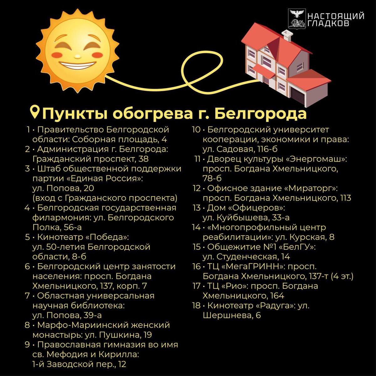 ❗️В Белгороде развёрнуто ещё 9 пунктов обогрева Как сообщил губернатор Вячеслав Гладков в утреннем обращении, 28 февраля в облцентре работает 18 таких пунктов. Дополнительные пункты расположены по следующим адресам: 📍Белгородский университет кооперации, экономики и права — ул. Садовая, 116б; 📍ДК «Энергомаш» — просп. Богдана Хмельницкого, 78б; 📍Офисное здание «Мираторг» — просп. Богдана Хмельницкого, 113; 📍Дом офицеров — ул. Куйбышева, 33а; 📍Многопрофильный центр реабилитации — ул. Курская, 8; 📍Общежитие №1 БелГУ — ул. Студенческая, 14; 📍ТЦ «МегаГРИНН» — просп. Богдана Хмельницкого, 137т (4 этаж); 📍ТЦ «Рио» — просп. Богдана Хмельницкого, 164; 📍Кинотеатр «Радуга» — ул. Шершнева, 6. Подписаться на 🗞🗞 | Мы в МАХ