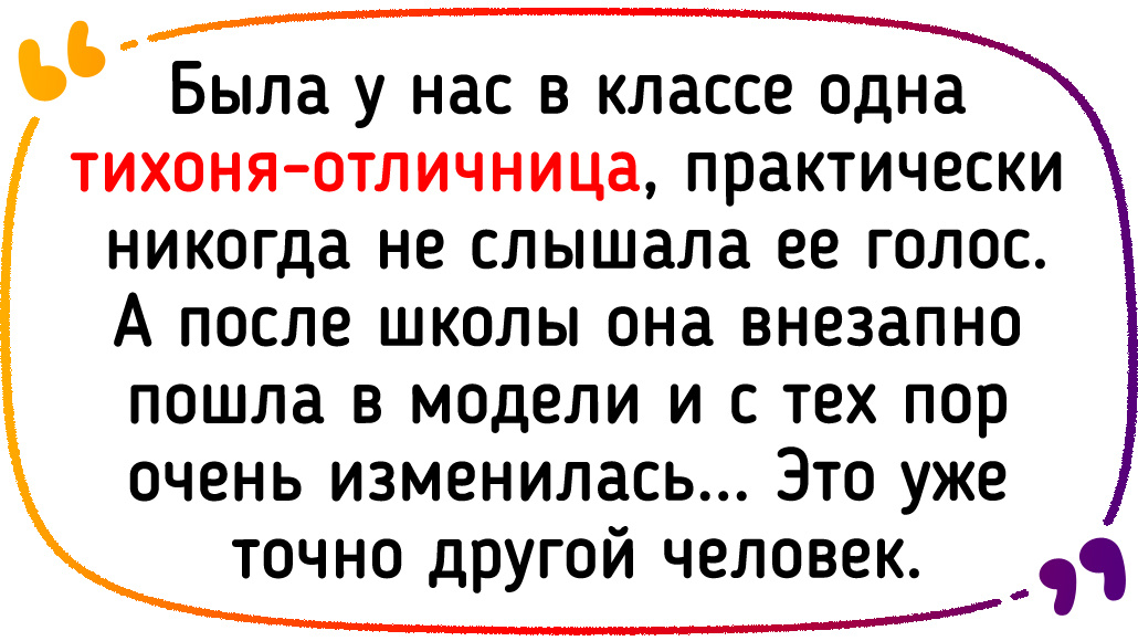 Была у нас в классе одна тихоня-отличница, практически никогда не слышала ее голос. А после школы она внезапно пошла в модели и с тех пор очень изменилась. Это уже точно другой человек. © Alex_Reitmar