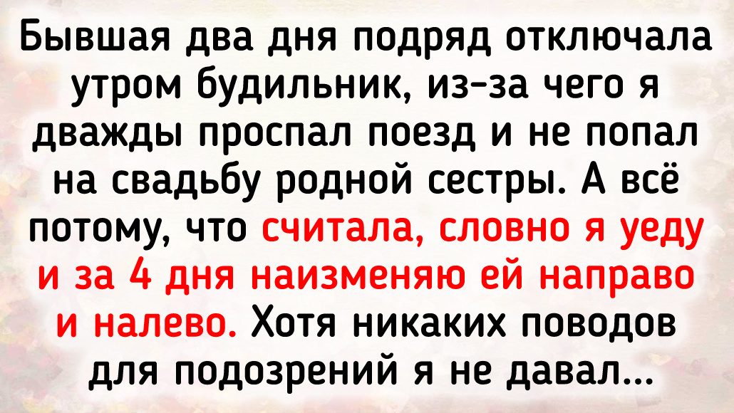 Бывшая два дня подряд отключала утром будильник, из-за чего я дважды проспал поезд и не попал на свадьбу родной сестры. А все потому, что считала, словно я уеду и за 4 дня наизменяю ей направо и налево. Хотя никаких поводов для подозрений я не давал. © Мишель Мадонна / ADME