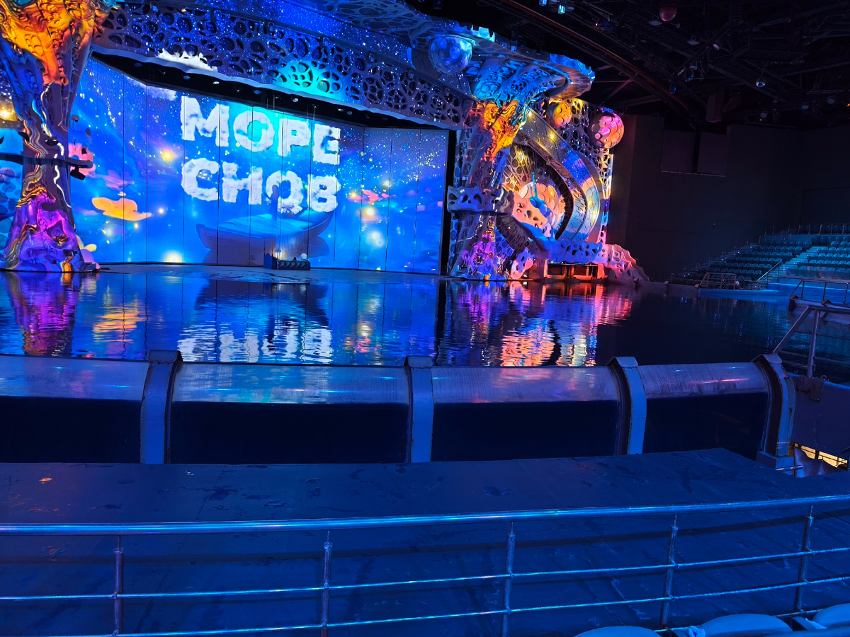 Мы были скептически настроены к шоу (особенно с учетом кучи негативных отзывов) но все же пошли после посещения аквариума, так он нам понравился. Отдельно прочитать можно здесь. Если идти на шоу - то аквариум в комплексе при единоразовой покупке будет дешевле. Идеальные места будут на нижних секциях по бокам от центрального яруса. Самые центральные чрезмерно дорогие, выше - не так хорошо видно, как на секциях б1 и б3 ряд 3-4. На 1-2 ряду не очень видно из-за перегородки и могут обрызгать, до 3 ряда брызги тоже чуть долетали, но не сильно. Идеально без брызг 4 ряд ближе к центру (чтоб не быть мокрыми). Забегая вперед скажу что обрызгать вас могут только в конце с дельфинами и касаткой - так что на них сразу надевайте дождевики, так как те кто не надел - ушли с мокрыми головами. А еще надевайте кофты, так как прохладно. Людей было очень мало на представлении, мы купили билеты С2 и спокойно пересели в сектор В3. Те кто высоко сидели и на С3 спокойно также пересаживались, никто не следил