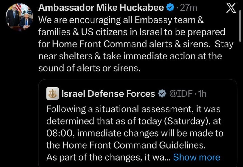Huckabee tells all US citizens to ‘stay near shelters’