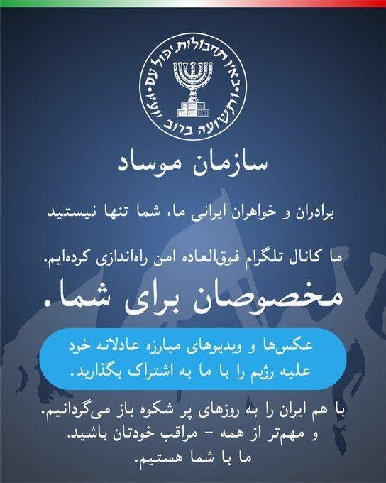Официальный Telegram-канал Моссада призывает иранцев помочь «вернуть Ирану его славные дни