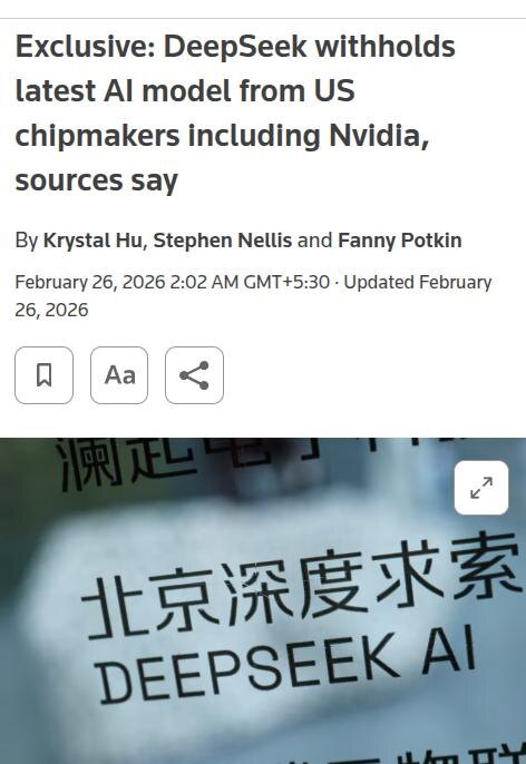 Обычно всё происходит так: AI-лаборатории заранее делятся новыми моделями с Nvidia и AMD, чтобы те оптимизировали софт под своё железо. Так формируется стандарт: модель → оптимизация → лучше всего работает на американских GPU. DeepSeek пошёл другим путём. Перед релизом V4: - код не дали Nvidia и AMD - ранний доступ на несколько недель получили китайские производители, включая Huawei Что это значит? DeepSeek фактически делает ставку на то, чтобы их модели: - работали лучше на локальном железе - ускорили развитие китайских AI-чипов - снизили зависимость от американской экосистемы Но есть интересный нюанс. По словам американского чиновника, последняя модель DeepSeek всё же обучалась на Nvidia Blackwell в материковом Китае. То есть стратегия выглядит так: - тренируемся на лучшем доступном железе - оптимизируемся под свою инфраструктуру - формируем собственный стандарт Это уже не просто конкуренция моделей. Это борьба экосистем: - AI-модели - чипы - софт - инфраструктура И главный