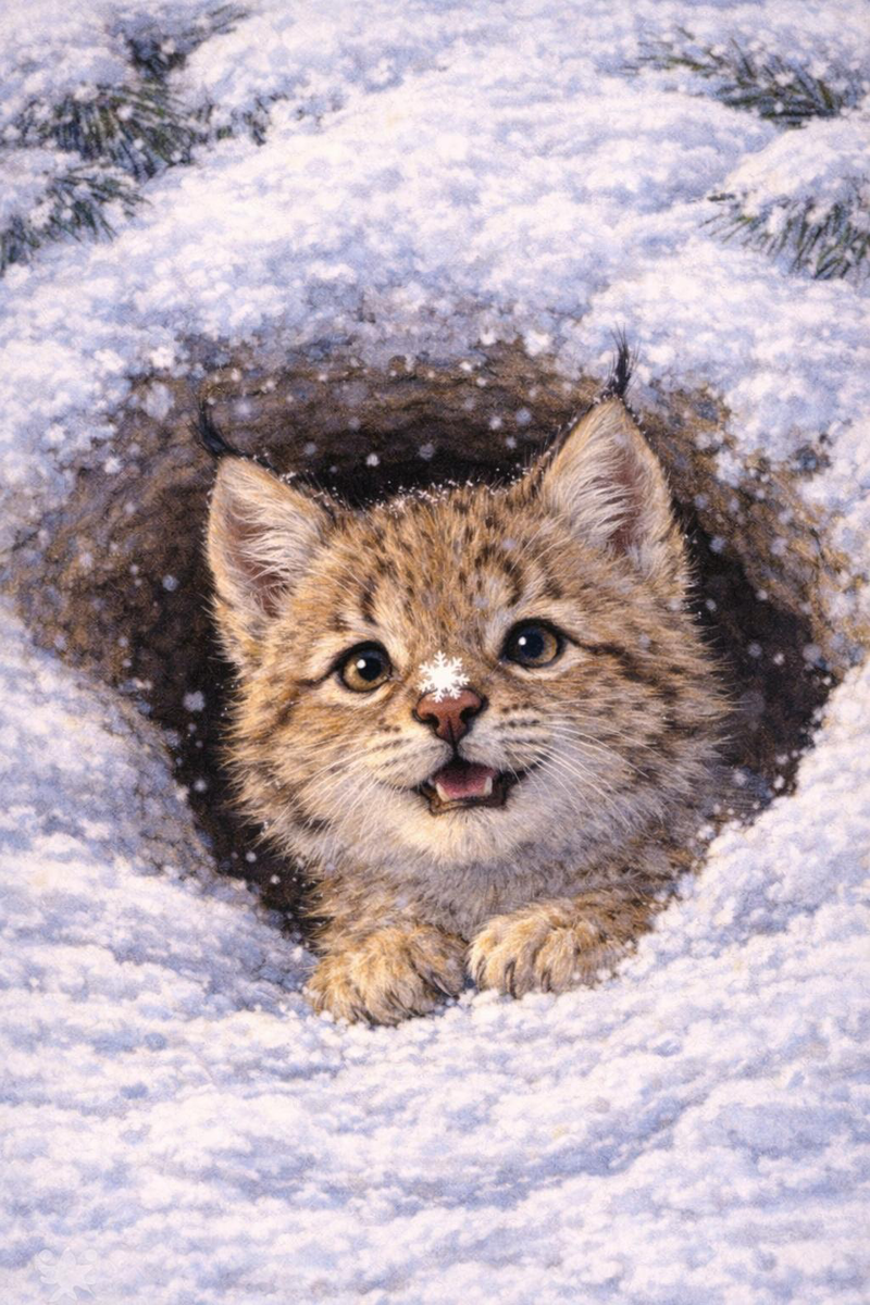 Про лес и помощь.❄️🌲 В самой гуще заснеженного леса, под пушистой елью жил маленький рысёнок. Его лапки были как тёплые меховые валенки, а на ушках торчали смешные кисточки. В тот день мама-рысь ушла на охоту. Рысёнок был ещё маленький,