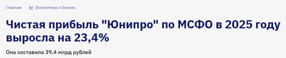 Юнипро отчиталась за 2025 год, продемонстрировав очень хорошие финансовые результаты. Согласно отчету по МСФО, в 2025 году продажи электроэнергии выросли на 21,2%, прибыль до налогообложения - на 28%, а чистая прибыль - на 23,4%. Она составила 39,4 млрд. рублей. Такой финансовый результат мог бы принести акционерам просто великолепные дивиденды. Рассчитаю их чисто теоретически. Энергокомпании направляют на дивиденды 50% от полученной прибыли, до 2022 года так делала и Юнипро. Половина нынешнего финансового результата - это 19,7 млрд. рублей. Общее число акций Юнипро составляет 63,049 млрд штук. Таким образом, расчетный дивиденд на одну акцию получается 0,31 рубль. Сейчас акции Юнипро стоят около 1,60 рубля, таким образом, дивидендная доходность могла бы составить более 19%, если бы не... 83,73% акций компании, принадлежащие немецкому концерну Uniper, в 2022 году переданы под внешнее управление Росимуществу. Распределение прибыли в виде дивидендов компания в таких условиях не осуществля