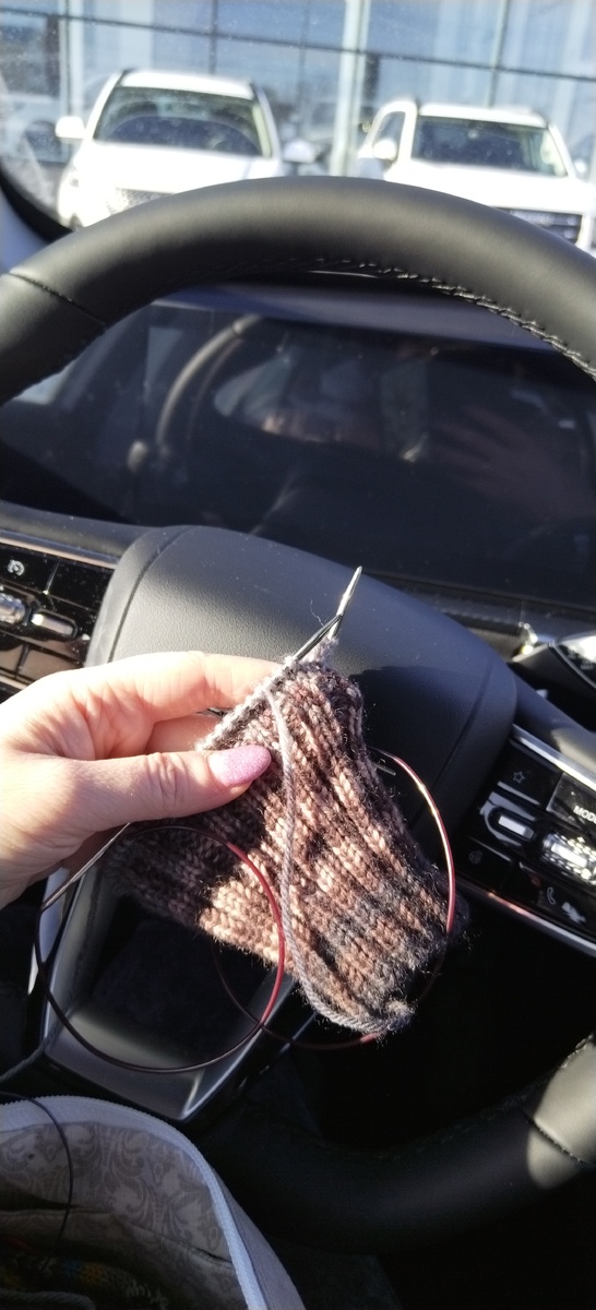 Нам с мужем надо было проходить ТО машины. Я заранее спросила мужа , сколько времени занимает эта вся процедура? Ответ был таков: 2 часа. Но думаю , что просто так сидеть и ждать. Возьму с собой какой нибудь процесс 🫠В итоге решила вязать носки мужу. Один носок был уже связан.