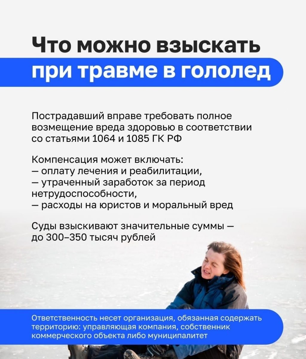 ». Если вы получили травму на нечищеном тротуаре — вы имеете право требовать компенсацию. По закону можно взыскать: — расходы на лечение — утраченный заработок — компенсацию морального вреда И да, отвечают те, кто обязан содержать территорию: управляющие компании, ТСЖ или муниципальные службы. Каждую зиму одно и то же: люди ломают руки, ноги, теряют работу — и молча идут домой. Кто сталкивался с травмой из-за гололёда в Нефтекамске? Писали претензию? Судились? Или «и так сойдёт»? 👉 Подписаться на канал