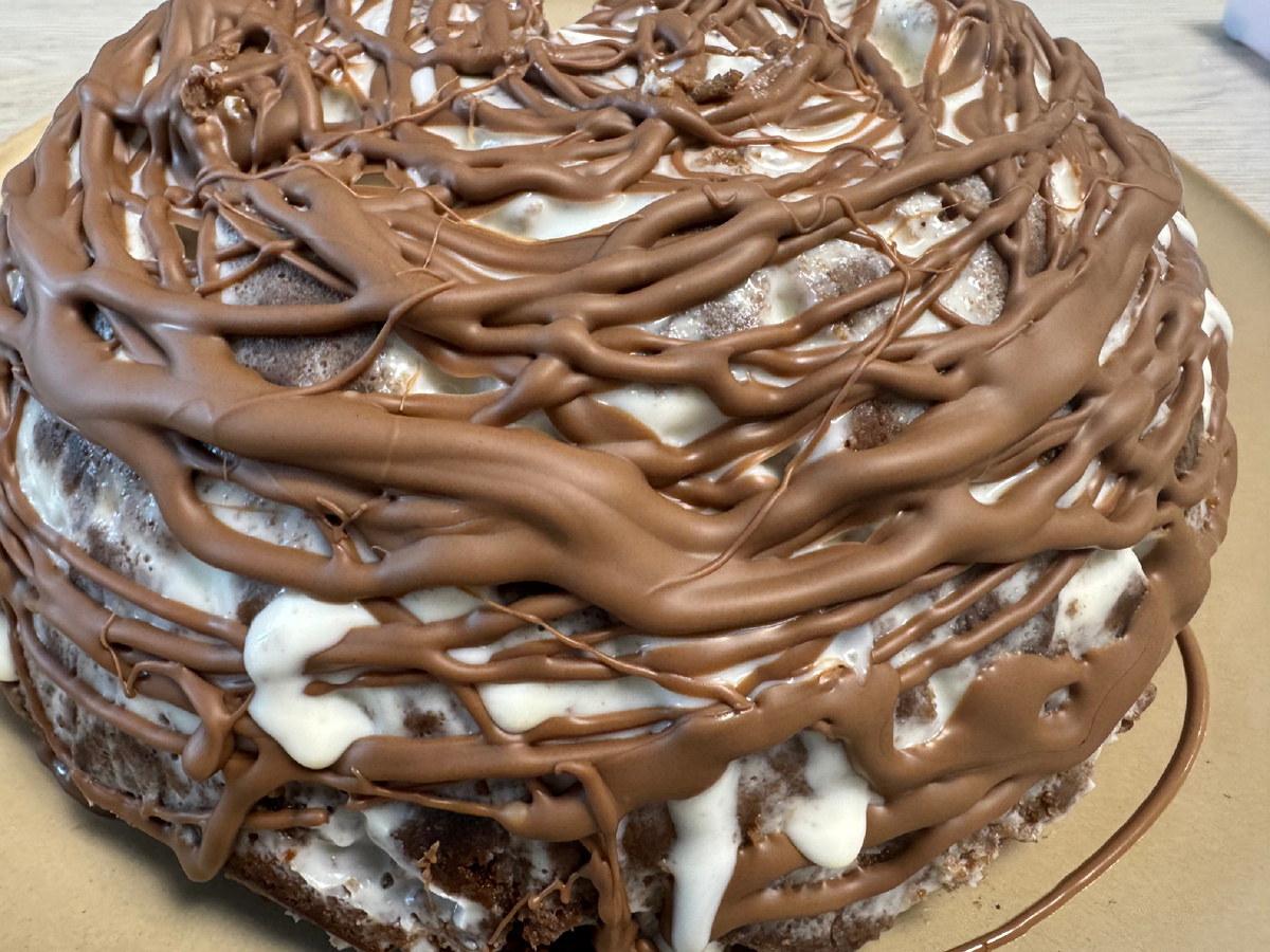 Утром достаньте торт из холодильника, снимите пленку и украсьте его растопленным молочным шоколадом.