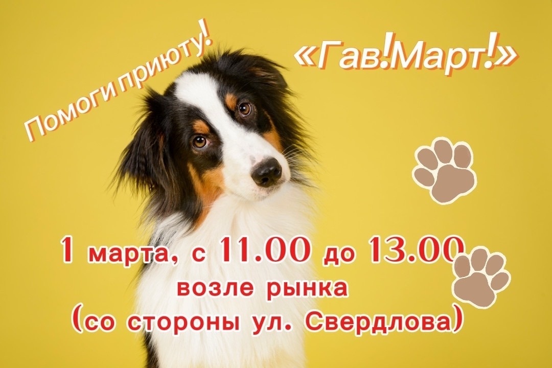 1 марта приют для бездомных животных проведёт первую весеннюю благотворительную акцию «Гав! Март!». Горожане могут помочь приюту финансово, принести корм для собак, крупы, мясные продукты и ветошь. На акции можно будет познакомиться и с самыми маленькими обитателями приюта — щенками, которые ищут дом. Акция пройдёт возле городского рынка со стороны улицы Свердлова с 11.00 до 13.00.