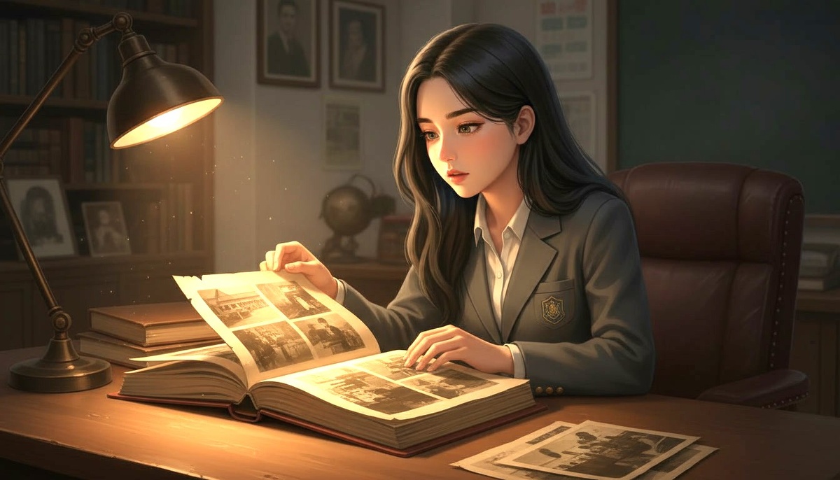 Он вдруг встал, и старый кожаный стул тихо заскрипел, будто вздохнул от облегчения. Директор подошел к массивному дубовому шкафу, двигаясь с неожиданной легкостью для своего возраста — его сгорбленная обычно спина сейчас казалась прямой, а шаги были легкими, почти танцующими. Пальцы, еще минуту назад уверенно листавшие официальные документы, теперь дрожали, когда он доставал с верхней полки пыльный кожаный альбом с потрескавшимся золотым тиснением.