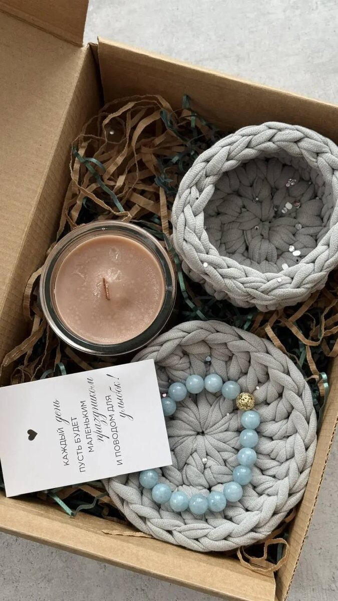 ! Мы с Алесей @Alesya_Guryanova решили наше творчество красиво уложить в коробочку и сделать для вас и ваших близких чудесный и уютный подарок! Погрузитесь в мир изящества и уюта с нашим эксклюзивным подарочным боксом, который создан, чтобы приносить счастье и вдохновение. Внутри вас ожидает ароматная свеча с деревянным фитилем, чей мягкий треск создает атмосферу тепла и спокойствия. Ручной работы браслет из натуральных камней станет вашим личным амулетом, заряженным на успех и финансовое благополучие. Дополняют композицию элегантная корзиночка и подставка из трикотажной пряжи, заботливо созданные вручную, чтобы добавить уют в ваш интерьер. Этот набор — идеальный подарок для тех, кто ценит уникальные вещи и стремится окружить себя позитивной энергией. Ценность набора-2350₽