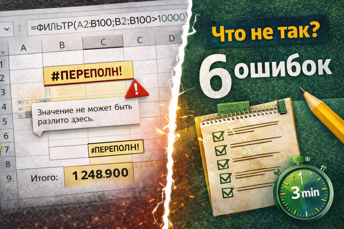 Динамические массивы в Excel: где подвох и почему формулы “разливаются” не туда. Разбор проблем с динамическими массивами в Excel: #ПЕРЕПОЛН!, блокировка диапазона, совместимость версий, конфликт с обычными формулами. Пошаговая диагностика + файл.