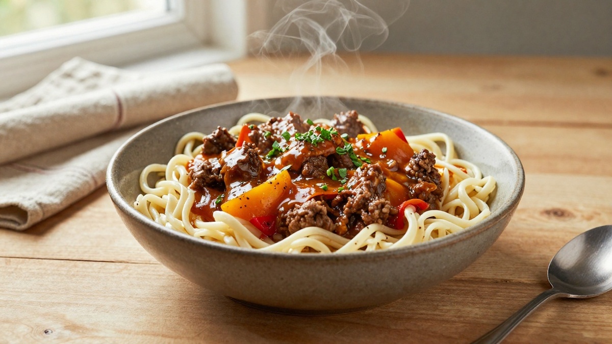 Сначала мы подготовим все ингредиенты и обжарим их, чтобы раскрыть ароматы. Затем мясо будет томиться в соусе, напитываясь вкусами. А лапшу мы приготовим отдельно, чтобы она осталась идеальной.