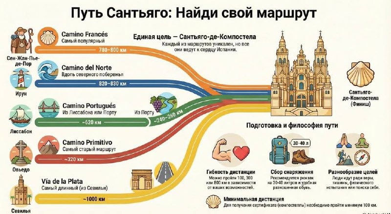 Это крупнейший паломнический маршрут Европы, ведущий к городу Сантьяго-де-Компостела в Испании, где, по преданию, покоятся мощи апостола Иакова. Однажды, когда выучу испанский до достаточного разговорного уровня, то подарю себе туда соло-путешествие😊 Путь Сантьяго — это не одна дорога, а обширная сеть маршрутов, которые сходятся в одной точке — соборе в Сантьяго-де-Компостела. История пути началась в IX веке, когда монах-отшельник обнаружил гробницу с мощами апостола. С тех пор он стал одним из главных паломничеств христианского мира. Сегодня по Камино идут не только верующие, но и туристы. Мотивы разные: желание побыть наедине с собой, проверить свои силы, найти новых друзей или просто насладиться природой и архитектурой Северной Испании. Основная часть большинства маршрутов проходит по северу Испании, но начинаться они могут во Франции, Португалии и других странах. Существует около 15 официальных маршрутов. Чтобы получить сертификат о прохождении (Compostela), нужно пройти пешк
